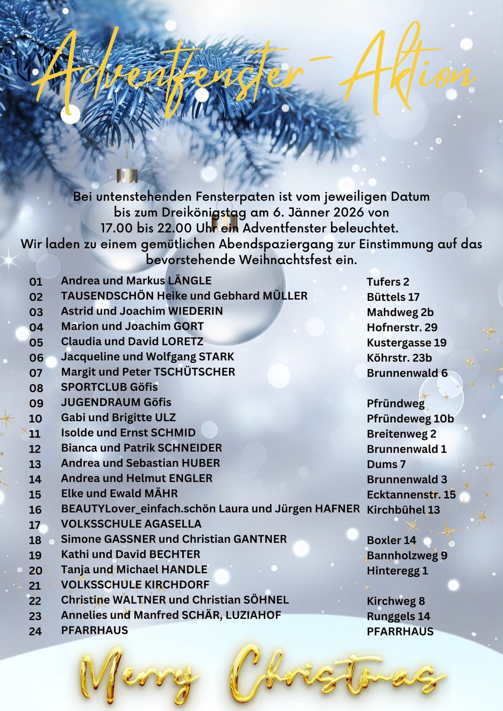 Göfner Familien, Gewerbetreibende sowie Schulen und die Kinderbetreuung gestalten 24 Adventfenster. Ab dem 1. Dezember 2025 wird jeden Tag ein weiteres Adventfenster beleuchtet.