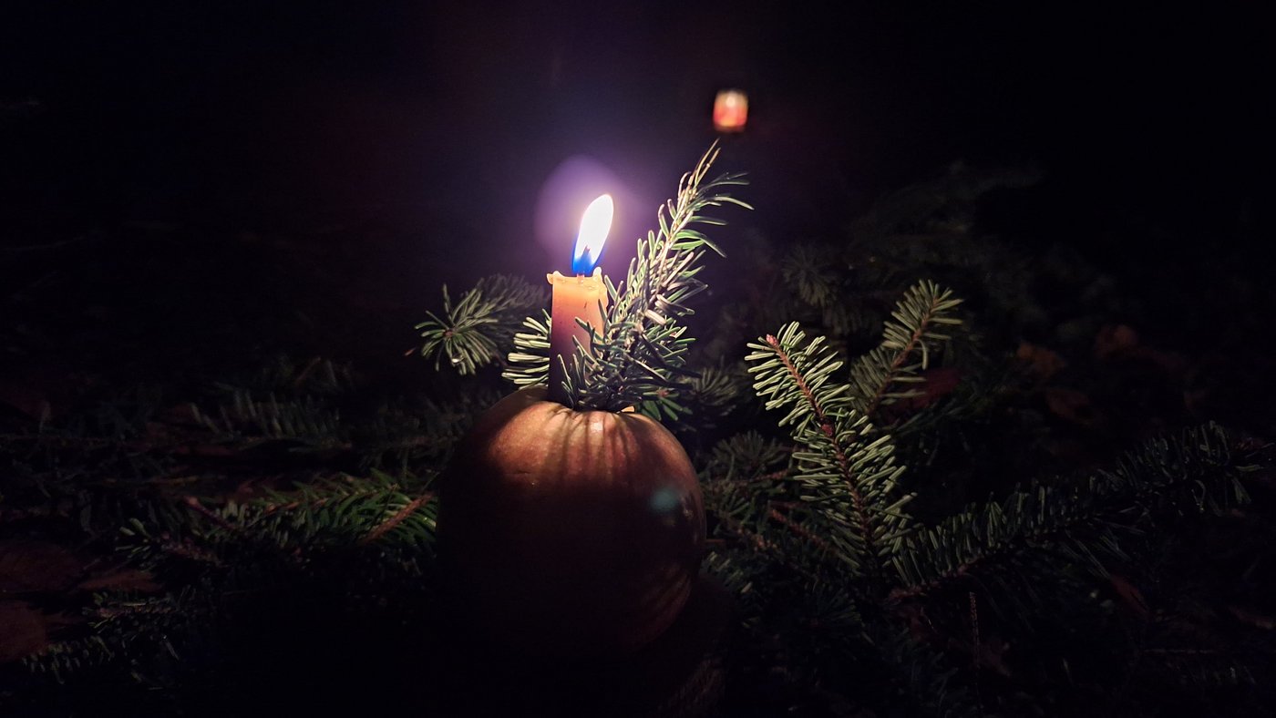 So wie jedes Jahr strahlte die zunehmend heller erleuchtete Tannenzweigspirale mit den Apfellichtern der Kinder in die dunkle Weite des Waldes. Besinnlich ergriffen schaut das Auge dem Lichterglanz im nächtlichen Wald entgegen. Eine fröhlich-friedvolle Stimmung umgreift das Geschehen.