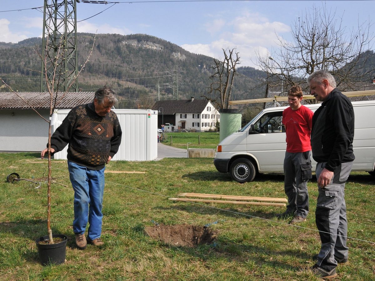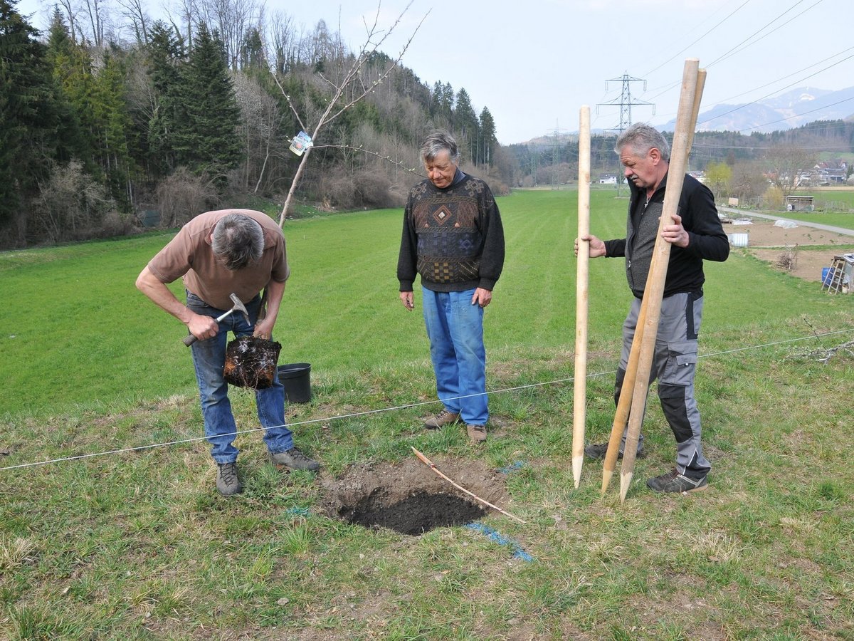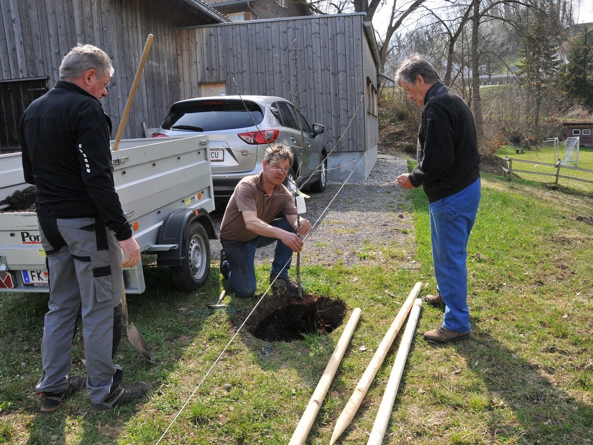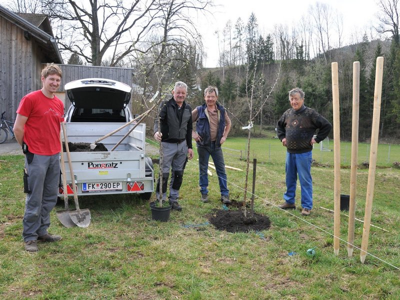 Bei der Bepflanzung der Obstbäume halfen Mosterei-Obmann Norbert Nesensohn, Gebhard Künzle, Georg Malin und Nikolaus Peer vom Obst- und Gartenbauverein Göfis tatkräftig mit.