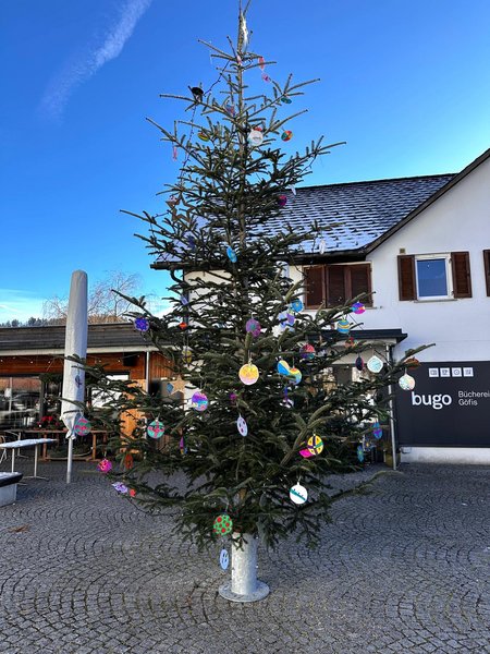 Der Christbaumschmuck beim bugo Platz wurde von den Göfner Volksschulkinder mit viel Liebe gebastelt.