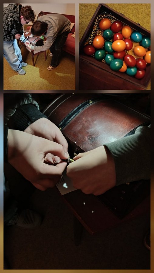 Schließlich gelang es uns gemeinsam, die Schatzkiste zu öffnen. Darin befanden sich bunte Eier und selbstgeknüpfte Freundschaftsbänder.