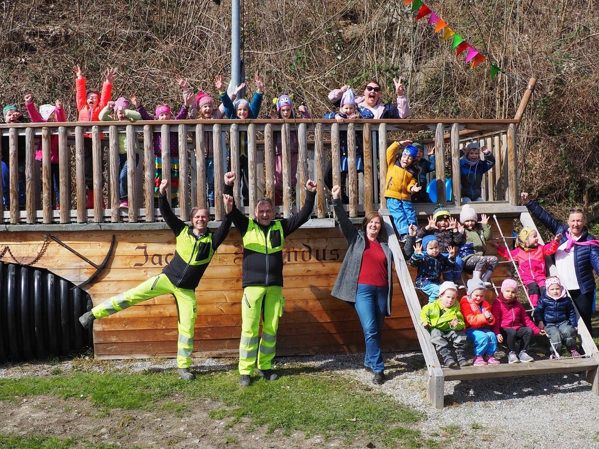 Seit wenigen Tagen ist der Spielplatz wieder vollumfänglich nützbar, was von den Kindern mit großer Begeisterung aufgenommen wurde. So nutzte der Kindergarten rund um Leiterin Maria Gstrein die Gunst des perfekten Wetters für einen umfangreichen Belastungstest zum einen und zu herzlichen Dankeschön an das Bauhofteam zum anderen.