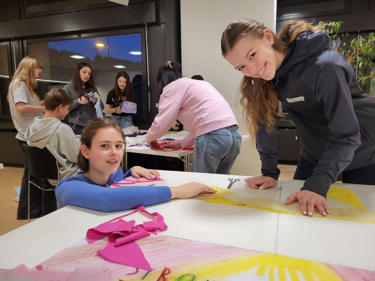 Im Anschluss suchte jede Gruppe die Stoffe für ihren Teil vom Gemeinschaftstuch aus und schnitt diese passend zu. Beim Sichten der Kurzfilme konnten wir gemeinsam entscheiden, welche gezeigt werden sollen. Nach getaner Arbeit gab es Snacks und lustige Abschlussspiele, welche Menschenmemory und eine Reise nach Jerusalem waren. Die 16 Jugendlichen, die dabei waren, fanden es alle sehr interessant ebenso wie die 4 Erwachsenen. Es waren dieses Mal auch 4 Ehrenamtliche mit dabei, welche uns beim Zuschneiden der Stoffe halfen und uns beim Zusammennähen tatkräftig unterstützen werden. Vielen Dank an Maria und Rosmarie Breuss, Hildegard Künz und Mary Breuss!