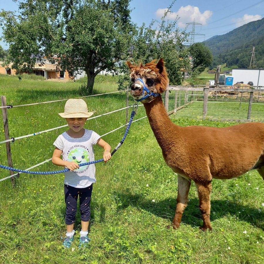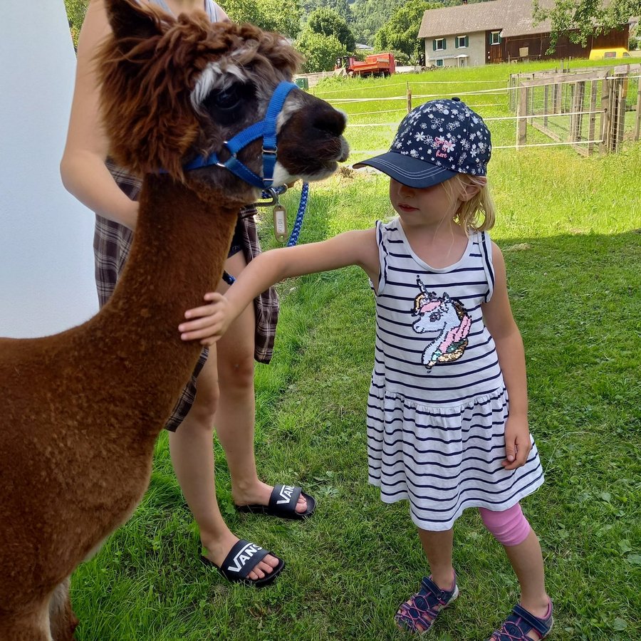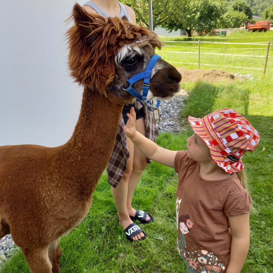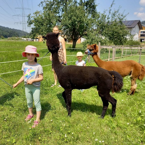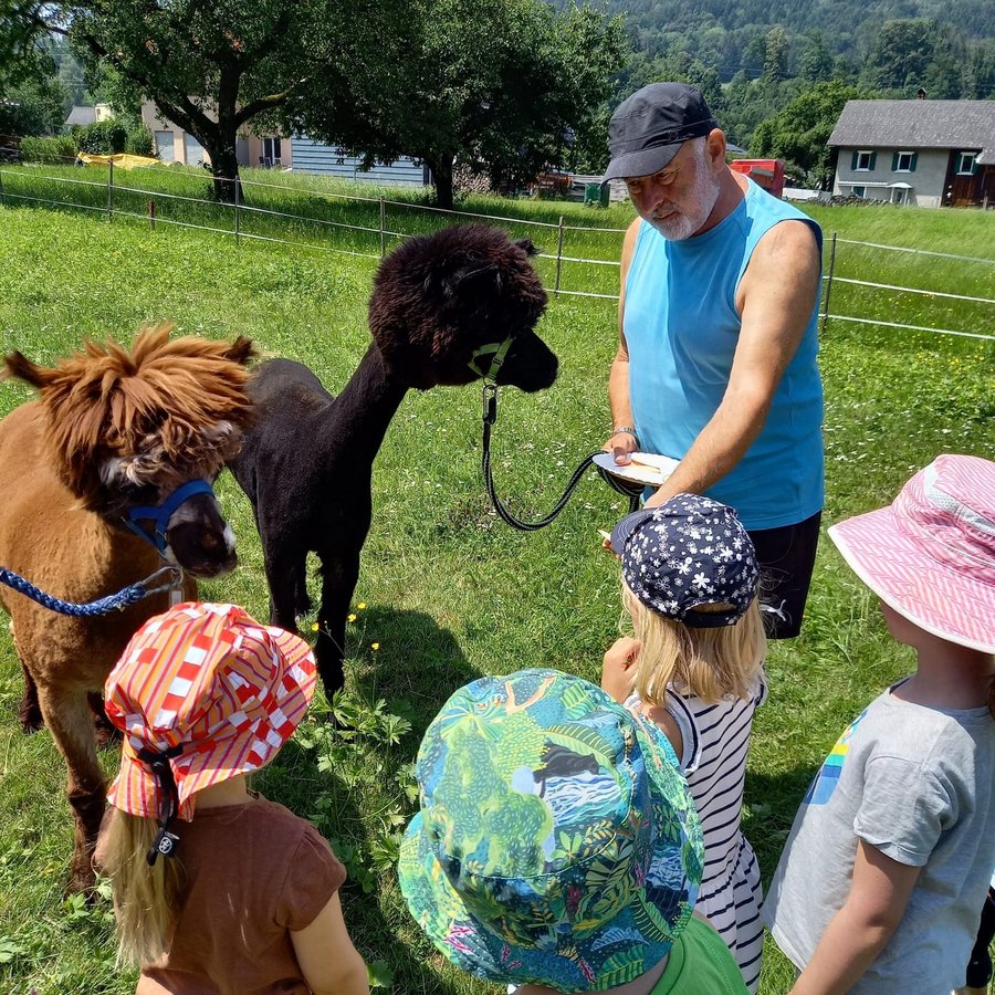 Am Mittwoch durften die Kinder die Alpakas Rudi und Moritz kennenlernen. Edi Lampert zeigte den Kindern die Gewohnheiten und ihre Vorlieben der Tiere. Anschließend durften sie die Alpakas mit der Leine führen.