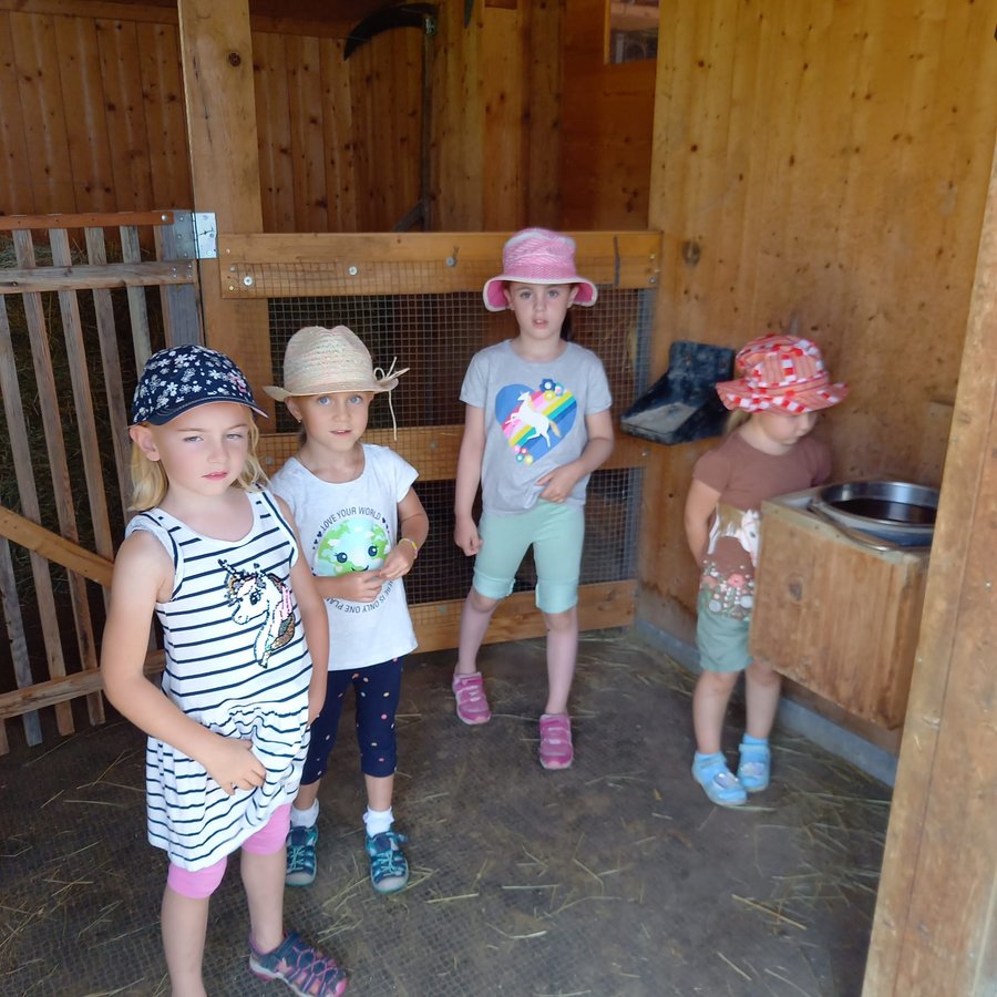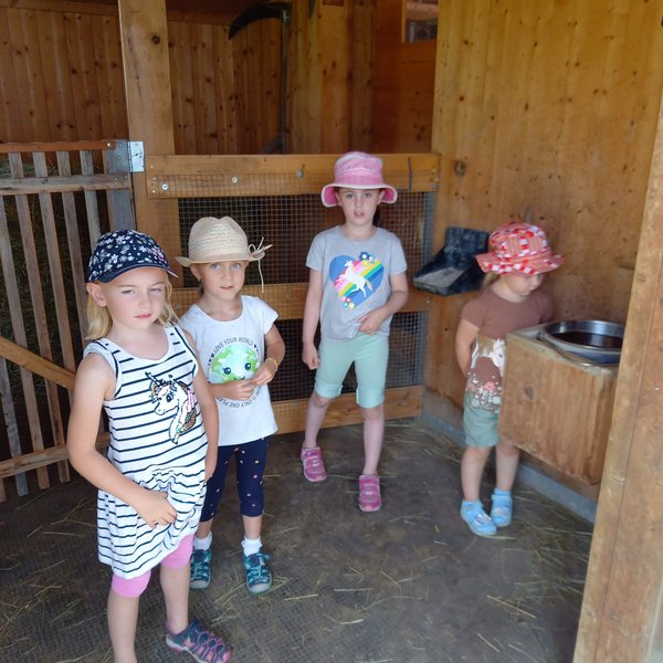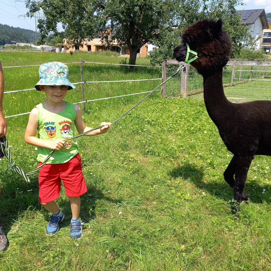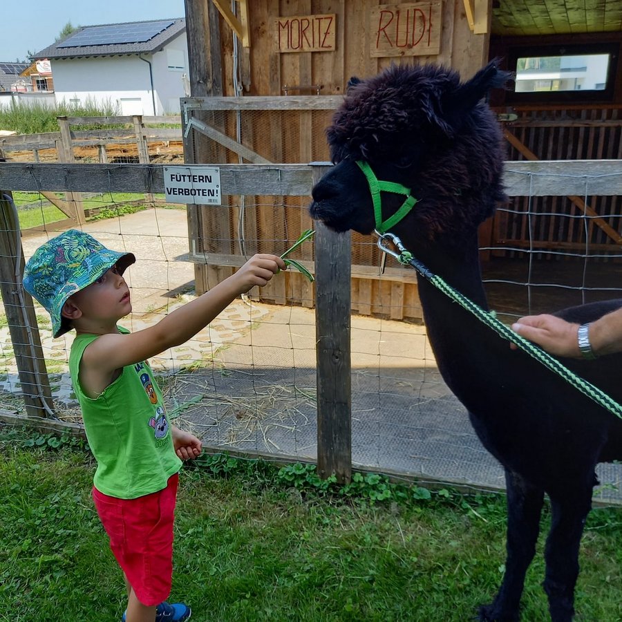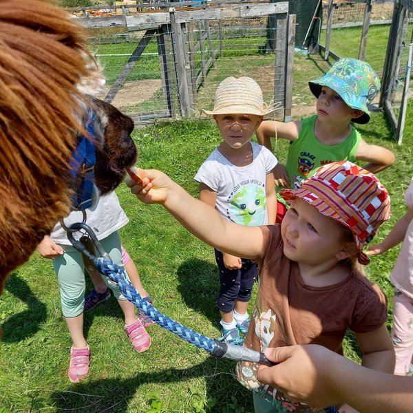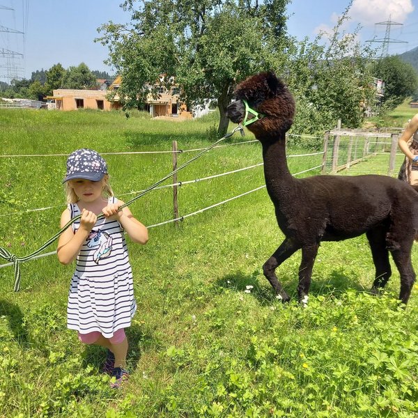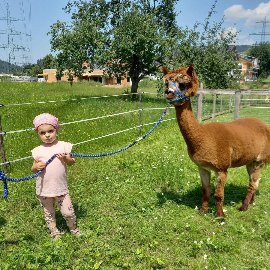 Am Mittwoch durften die Kinder die Alpakas Rudi und Moritz kennenlernen. Edi Lampert zeigte den Kindern die Gewohnheiten und ihre Vorlieben der Tiere. Anschließend durften sie die Alpakas mit der Leine führen.