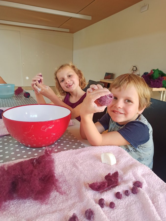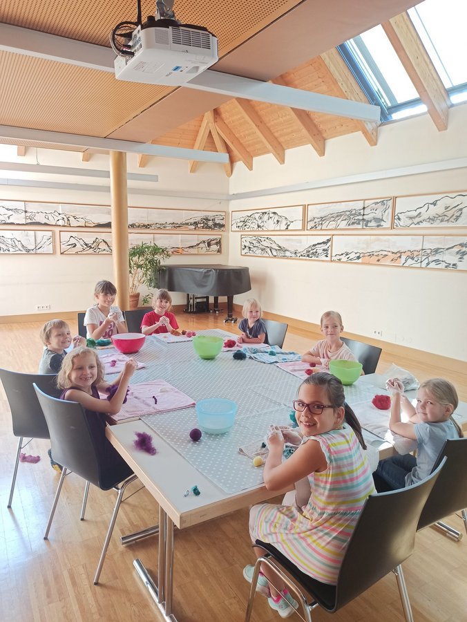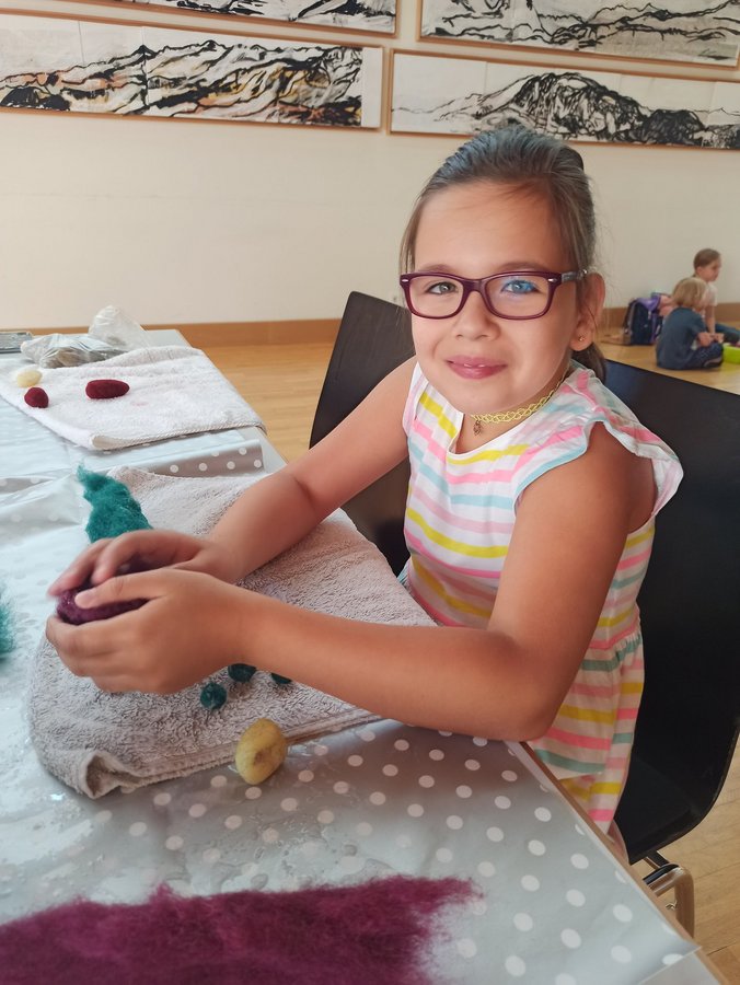 Beim Göfner Kindersommer bastelten die Kinder verschiedene Sachen aus Filz. Gemeinsam haben wir mit viel Spaß, Freude und Ausdauer in unserer kleinen Filzwerkstatt viele schöne Dinge gefilzt. Neben kleinen Bällen, Ketten und Armbändern haben die Kinder Fantasietiere, Blumen und andere kreative Werkstücke angefertigt. Bunte Filzwolle durfte natürlich nicht fehlen und auch tolle Kinderlieder.