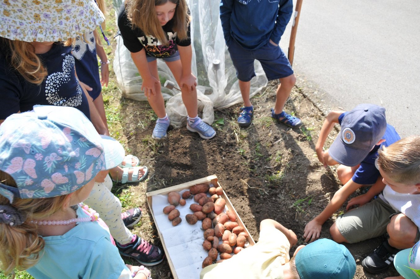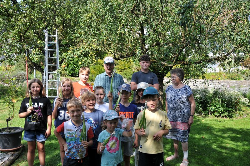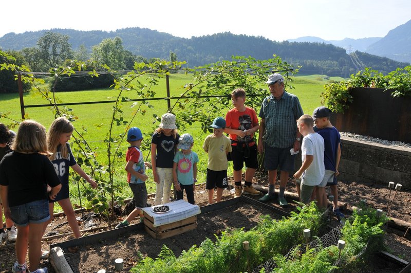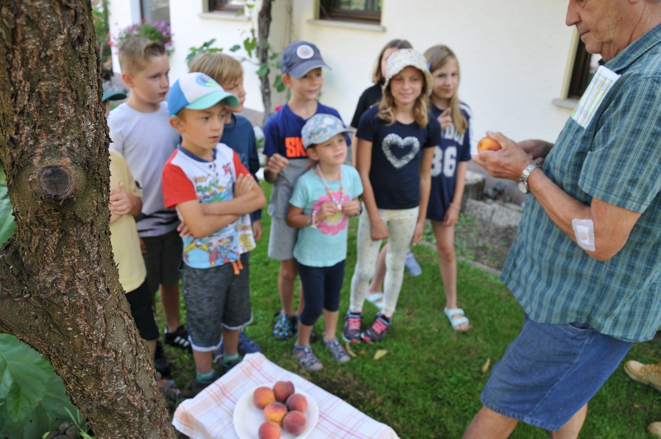 Nikolaus Peer erklärte den Kindern die Vielfalt im Garten. Die Kinder durften die verschiedenen Früchte und Obstsorten probieren und anschauen.
