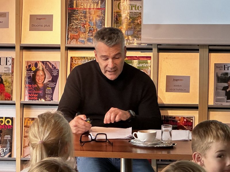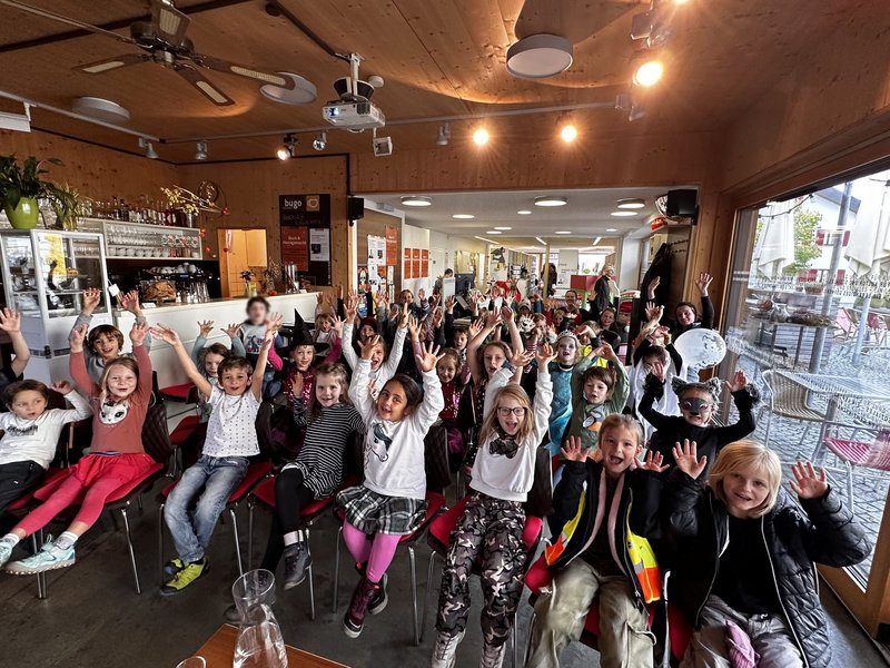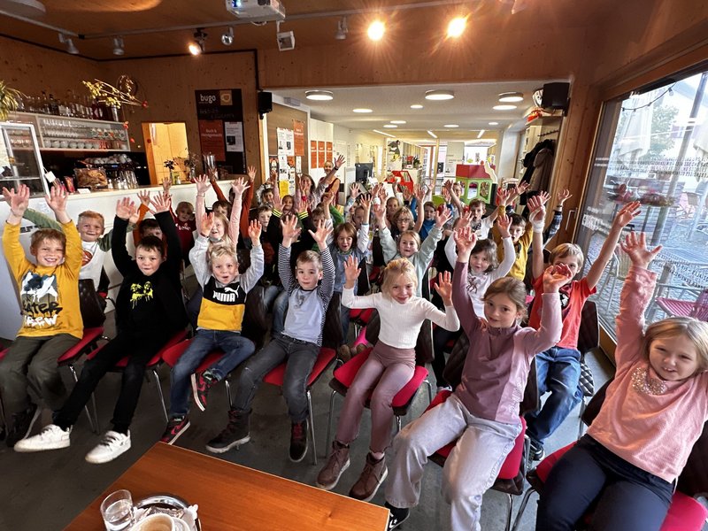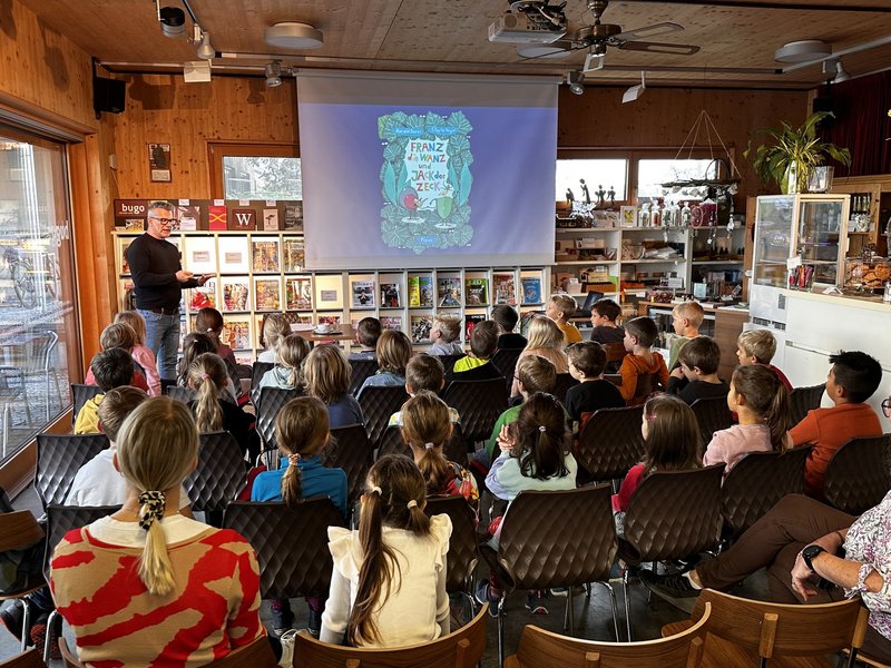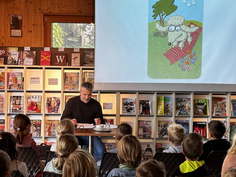 Die rund 100 Kinder der ersten und zweiten Schulklassen der beiden Volksschulen hatten große Freude mit Harald Darer, der für die zwei Lesungen im Göfner bugo extra aus Wien anreiste!