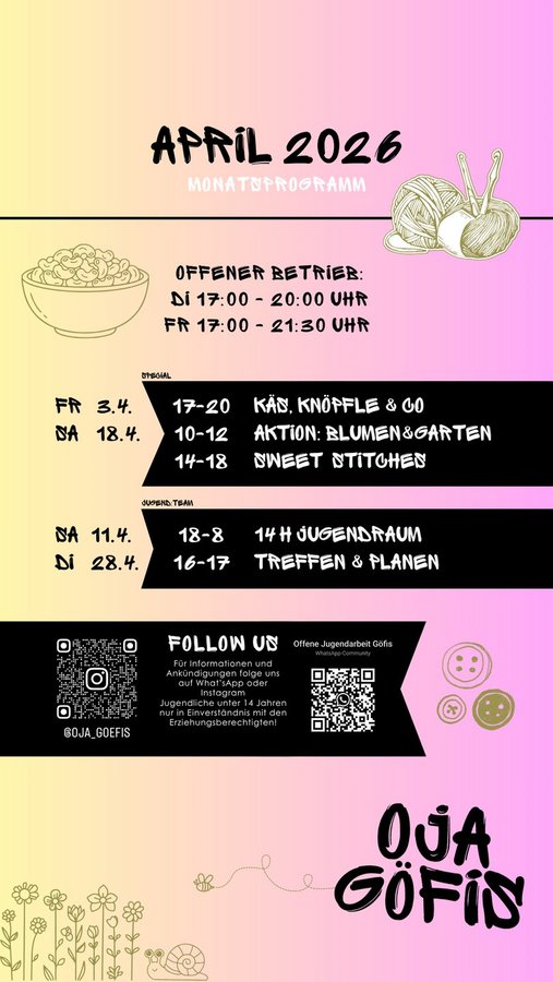 Du hast Bock auf gutes Essen und willst wissen, wie man richtig leckere Käsknöpfle macht? Bei unserer Kochsession im Jugendraum kochen wir gemeinsam das Vorarlberger Nationalgericht – natürlich nach einem geheimen Spezialrezept von der Oma. Wir bereiten den Teig zu, reiben den Käse und zaubern zusammen eine richtig gute Pfanne voll Knöpfle. Nebenbei wird geschnippelt, gerührt, gelacht und natürlich gemeinsam gegessen. Komm vorbei, wenn du Lust auf gemütliches Kochen, guten Käseduft und eine feine Zeit im Jugendraum hast.