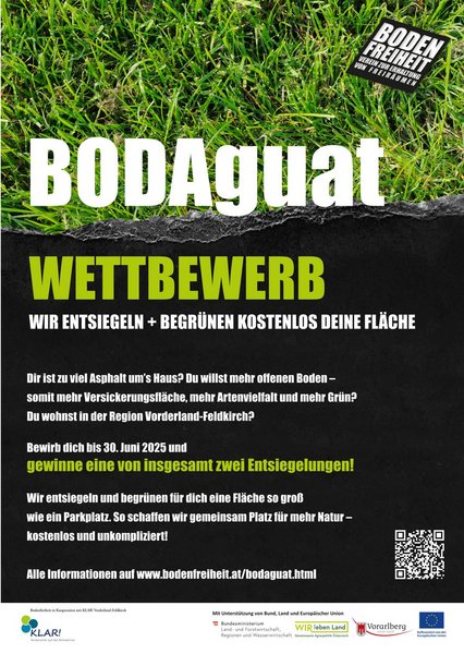 Zusammen mit Vorträgen, DIY-Workshops und Exkursionen ist der Wettbewerb Teil des LEADER geförderten Projekts „BODAguat – Einfach Entsiegeln und Begrünen“ in der Region Vorderland-Walgau-Bludenz. Das Projekt wird vom gemeinnützigen Verein Bodenfreiheit umgesetzt, unterstützt durch die KLAR! Region Vorderland-Feldkirch.