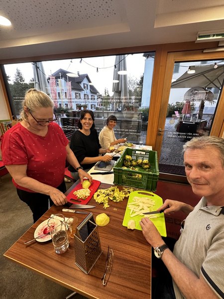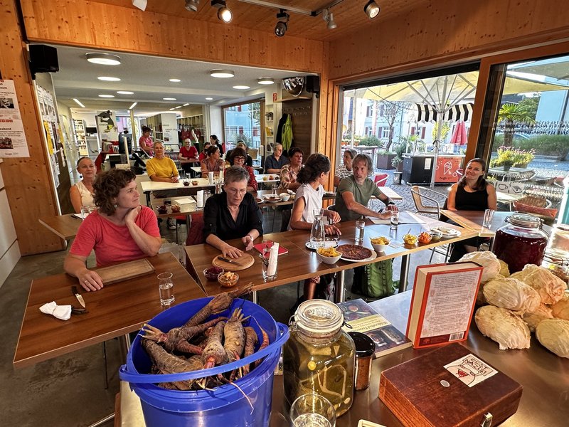 Die 20 Seminarteilnehmer:innen lernten dann vor Ort, das Gemüse zu Schneiden, zu würzen und zu kneten und füllten es dann in die mitgebrachten Gläser. Sanjay Bösch brachte auch viele Kostproben mit und überließ den begeisterten Teilnehmer:innen ein umfangreiches Skriptum.