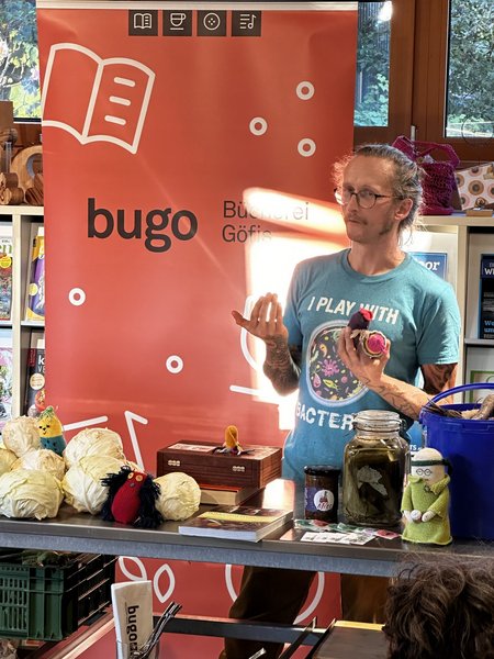 Fermentation ist nicht nur der älteste Prozess, den die Menschheit, zur Lebensmittelverarbeitung und Haltbarmachung, verwendet, sondern auch ein allgegenwärtiger Prozess, der Kulturen wandelt, uns am Leben hält und das alles auch noch ohne viel Energieaufwand. „Mit fermentiertem Gemüse lassen sich die Überschüsse aus dem Garten für die kalte Zeit konservieren, zugleich tun wir mit jedem Biss etwas Gutes für unser Mikrobiom und verbinden uns mit unzähligen kleinen Lebewesen.“, erklärt Sanjay Bösch in seinem Vortrag über Fermentation von Gemüse.