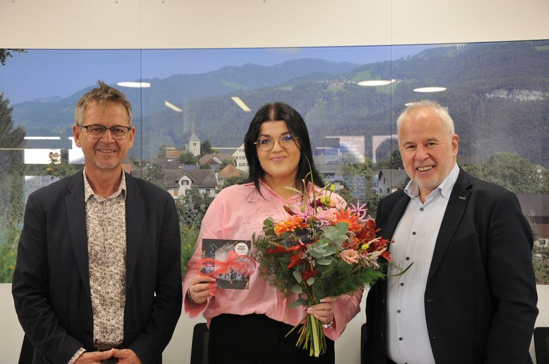 Adea Sadikaj absolvierte die dreijährige Lehrzeit als Verwaltungsassistentin im Gemeindeamt Göfis. Bürgermeister Thomas Lampert und Gemeindesekretär Rudi Malin gratulierten Adea zur bestandenen Lehrabschlussprüfung, bedankten sich für die sehr gute Mitarbeit und wünschten ihr alles Gute für ihren beruflichen und privaten Lebensweg. Adea hatte neben ihrer Tätigkeit im Gemeindeamt auch Aufgaben in der Schülerbetreuung sowie in der bugo Bücherei übernommen. Ein besonderes Markenzeichen war ihr freundlicher und herzlicher Umgang mit den Menschen.
