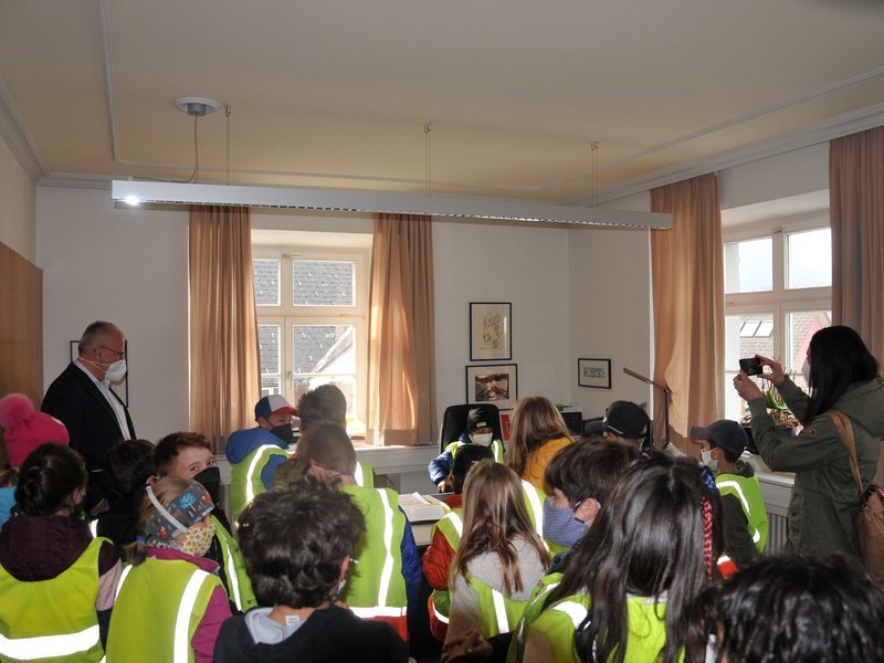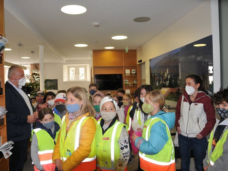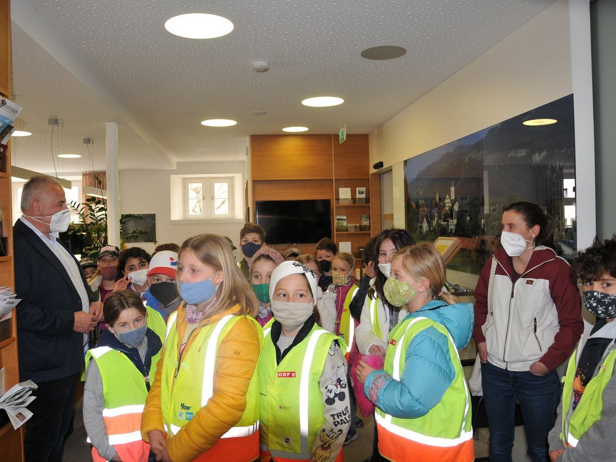 Die Volkschüler wurden vom Bürgermeister in Empfang genommen und konnten sich auch gleich als Erstes das Büro von ihm ansehen. Natürlich bekam jeder die Chance sich auf den Bürosessel des Bürgermeisters zu setzten um sich wie ein richtiger Bürgermeister zu fühlen.