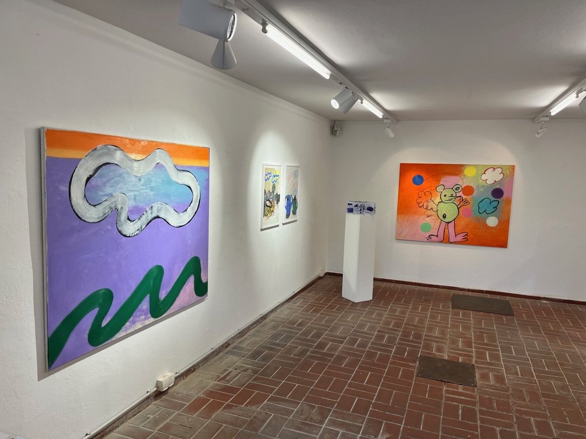 In der aktuellen Ausstellung zeigt die Künstlerin Ölbilder sowie Arbeiten auf Papier aus den letzten Jahren. Im Zentrum ihres Schaffens steht der geheimnisvolle „Mausbär“ – eine Figur, die laut Falk eines Tages „an die Tür klopfte und nicht mehr ging“. Diese Wesen, größer als Mäuse und kleiner als Bären, mit langer spitzer Nase und großen Ohren, bevölkern die Bildwelten der Künstlerin. Mal bekleidet, mal barfuß, bewegen sie sich durch poetische Landschaften und vermitteln dabei unterschiedlichste Stimmungen: verspielt, unbeschwert, selbstbewusst oder nachdenklich – stets mit einer besonderen Leichtigkeit und feinem Humor.