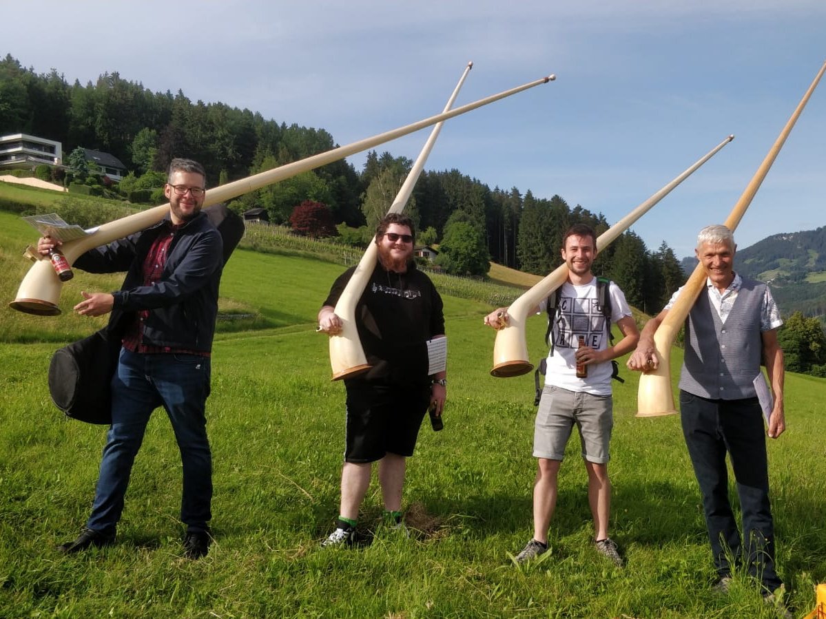 Die Göfner Alphornrunde mit Emanuel Schöch, Tobias Lampert, Philipp Kinzl und Bertram Sonderegger erfüllt den Pavillon im bugo‑Garten mit Alphornklängen.
