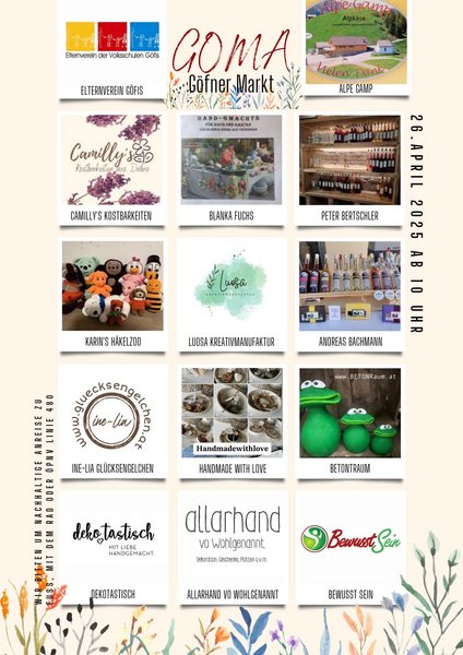 Am Samstag, dem 26. April 2025 ist es wieder so weit: Der Göfner Frühjahrsmarkt findet von 10:00 bis 16:00 Uhr rund um das Gemeindeamt Göfis statt.