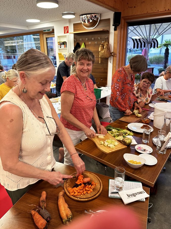 Die 20 Seminarteilnehmer:innen lernten dann vor Ort, das Gemüse zu Schneiden, zu würzen und zu kneten und füllten es dann in die mitgebrachten Gläser. Sanjay Bösch brachte auch viele Kostproben mit und überließ den begeisterten Teilnehmer:innen ein umfangreiches Skriptum.