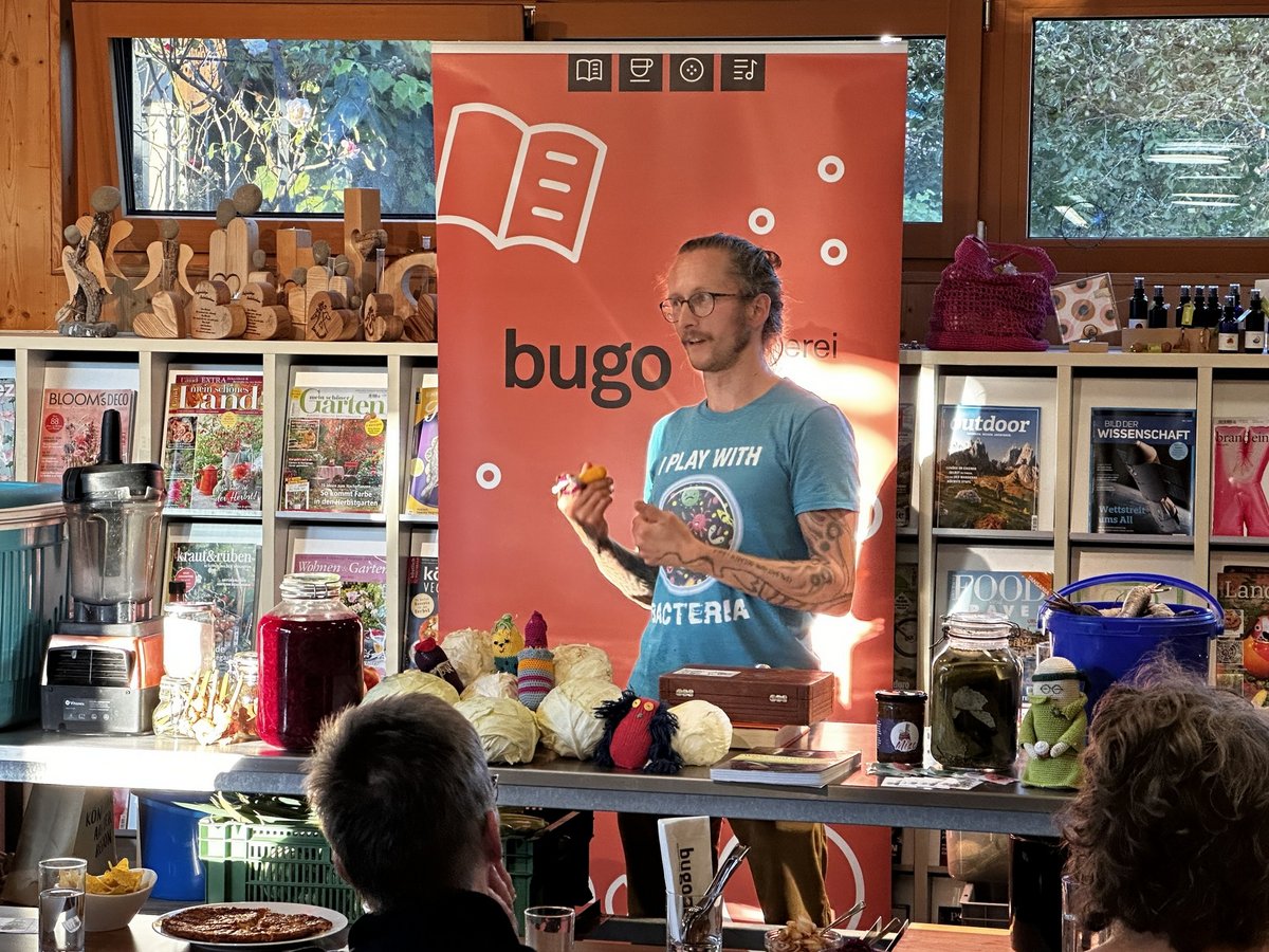 Fermentation ist nicht nur der älteste Prozess, den die Menschheit, zur Lebensmittelverarbeitung und Haltbarmachung, verwendet, sondern auch ein allgegenwärtiger Prozess, der Kulturen wandelt, uns am Leben hält und das alles auch noch ohne viel Energieaufwand. „Mit fermentiertem Gemüse lassen sich die Überschüsse aus dem Garten für die kalte Zeit konservieren, zugleich tun wir mit jedem Biss etwas Gutes für unser Mikrobiom und verbinden uns mit unzähligen kleinen Lebewesen.“, erklärt Sanjay Bösch in seinem Vortrag über Fermentation von Gemüse.